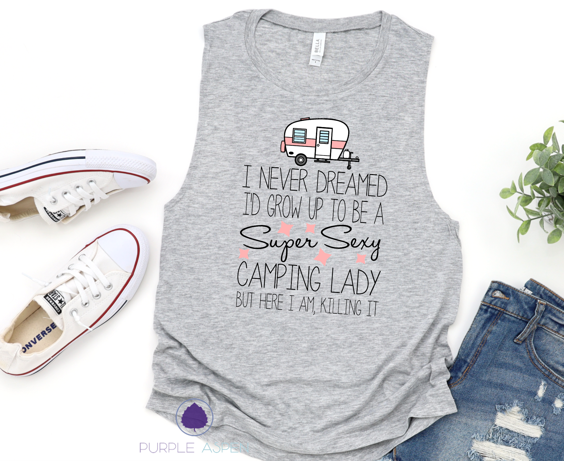 Shown on a Heather Grey Women's Muscle Tank Top Shirt with black lettering and a pink and white camper.