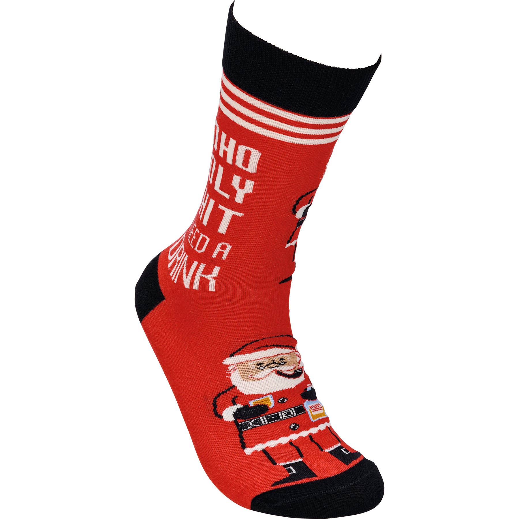 ta Claus drinking a glass of rum designs with a hand lettered "HoHo Holy Shit I Need A Drink" sentiment. Cotton, nylon, spandex. Our I Need A Drink socks are one size fits most.